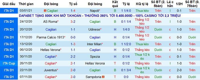 Lần gần nhất tiếp đón Benevento, Cagliari chấp Benevento với tỷ lệ 0:3/4 và Cagliari thắng kèo (thắng 2-1). Tới lần tái đấu này, Cagliari chỉ được xếp ngang cửa với ‘tân binh’ của Serie A 2020/21. Với việc đã thắng kèo ở 3/4 trận sân khách gần đây, Benevento hứa hẹn trở thành sự lựa chọn đáng tin hơn.