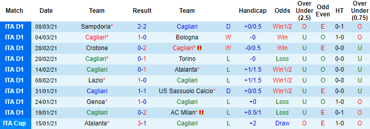 Mùa giải trước khi tiếp đón Juventus trên sân nhà trong khuôn khổ Serie A, Cagliari đã giành chiến thắng thuyết phục với tỷ số 2-0. Trận đấu sắp tới Cagliari đang rất tự tin với phong độ vào phom. 3 trận gần đây họ đạt thành tích bất bại với 2 chiến thắng và 1 trận hòa.