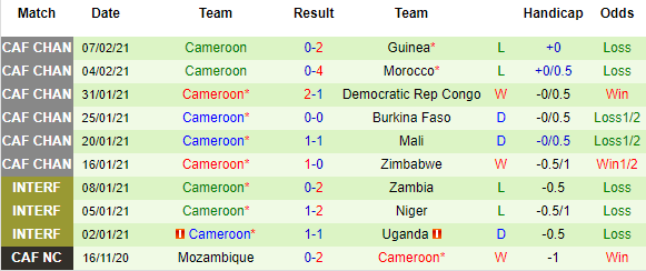 Cameroon chính là chủ nhà của VCK CAN 2021 nên mặc nhiên có vé vào VCK. Nhưng kể cả không là chủ nhà thì những chú “sư tử bất khuất” vẫn thừa khả năng xuất hiện ở VCK. Họ vẫn tham gia vòng loại ở bảng F và dễ dàng có được vị trí dẫn đầu sau 3 chiến thắng và 1 trận hòa.