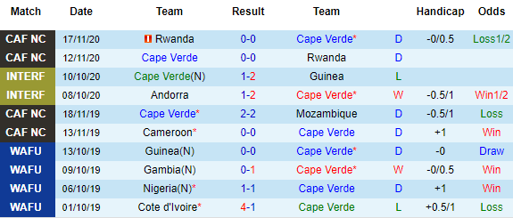 + Thống kê 10 trận gần nhất của Cape Verde
