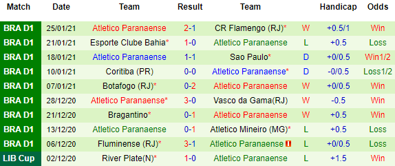 + Thống kê 10 trận gần nhất của Atletico Paranaense