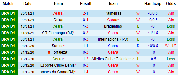 Ceara có ưu thế về mặt sân bãi, nhưng thành tích đối đầu lại không ủng hộ họ. Theo đó thì ở 10 lần chạm trán gần đây giữa đôi bên, Ceara chỉ có 1 chiến thắng trong khi thua 3 trận. Rõ ràng NHM Ceara có chút lo lắng cho đội bóng con cưng ở trận cầu này.