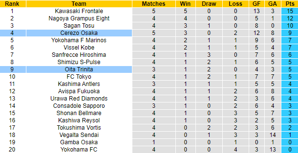 Niềm tin vào chiến thắng của Cerezo Osaka được củng cố khi đối thủ của họ là Oita Trinita. 4 lần đối đầu Oita Trinita gần đây tính trên mọi đấu trường, Cerezo Osaka toàn thắng, ghi 6 bàn mà không để thủng lưới lần nào. Oita Trinita có lối chơi được đánh giá cởi mở, sẵn sàng chơi đôi công trước mọi đối thủ. Vì vậy khi gặp Cerezo Osaka chơi phòng ngự phản công họ thường dễ dàng bị bắt bài.