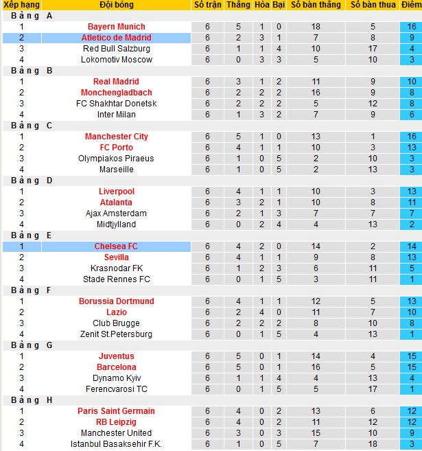 Bảng xếp hạngcúp C1 châu Âu giai đoạn vòng bảng