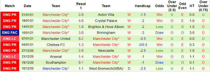 - Thống kê 10 trận gần nhất của Man City
