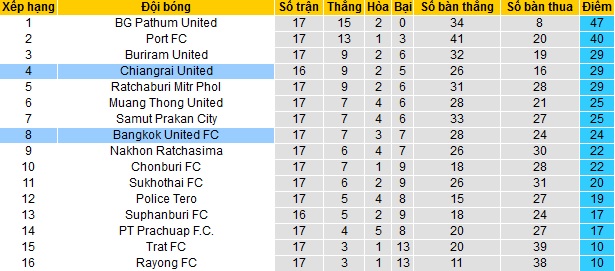 Bảng xếp hạng giải VĐQG Thái Lan trước vòng 18