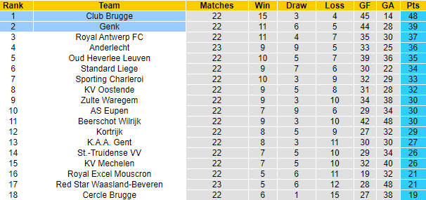 Trong khi đó, Racing Genk đang đứng thứ 2, ngay sau Club Brugge và họ cũng sáng cửa có mặt ở giai đoạn Championship Round tranh ngôi vương. Nhưng nếu như Club Brugge gần như chắc chắn xuất hiện ở top 4 đội đầu tiên do bỏ xa đối thủ thứ 5 thì Racing Genk cần nỗ lực nhiều hơn.