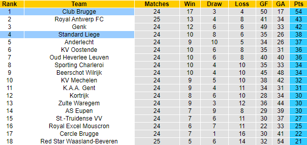 Nên biết là giải đấu năm nay sẽ chọn ra 4 cái tên dẫn đầu vào đá lượt trận tranh chức vô địch, và Standard Liege phải nỗ lực để giữ vững vị trí trong top 4. Đừng quên là các đội phía sau chỉ kém họ có 1, 2 điểm, khoảng cách rất mong manh và có thể bị san lấp bất cứ lúc nào.