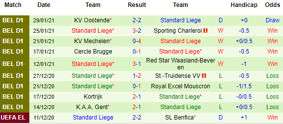 + Thống kê 10 trận gần nhất của Standard Liege