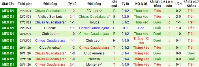 + Thống kê 10 trận gần nhất của Guadalajara Chivas