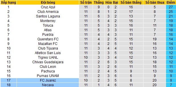 Bảng xếp hạng giải VĐQG Mexico trước vòng 12