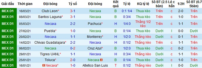 + Thống kê 10 trận gần nhất của Club Necaxa