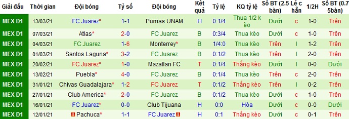 Trong 5 trận đấu gần đây Juárez chỉ có được 1 trận thắng, để thua cả 3 trận và hòa 1 trận. Trên sân khách đội bóng cũng chỉ có được 1 trận thắng duy nhất, để thua cả 4 trận còn lại trong 5 lần du đấu gần đây.