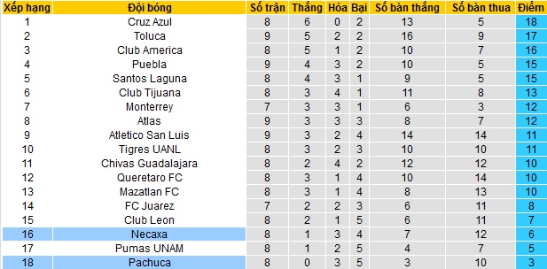 Bảng xếp hạng giải VĐQG Mexico vòng 9