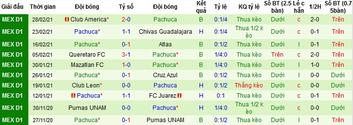 + Thống kê 10 trận gần nhất của Pachuca