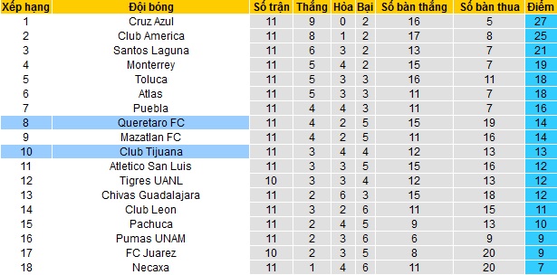 Trong khi đó Querétaro cũng đang nằm trong nhóm các đội có suất dự play-off khi đứng trên đối thủ 2 bậc ở vị trí thứ 8. Với 14 điểm có được cũng sau 11 vòng đấu, khoảng cách của Querétaro đến các đội Top 4 hiện đang là 5 điểm.