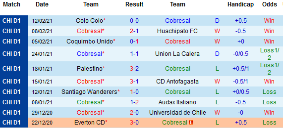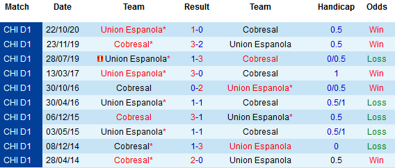 Cụ thể, Cobresal mới là đội được xếp vào thế cửa trên với kèo chính chấp lên đến 1/2. Đây là chỉ số khá bất ngờ trong hoàn cảnh chủ nhà có thành tích khiêm tốn hơn đáng kể. Thực tế, đây là tỷ lệ cao nhất mà Cobresal có được kể từ năm 2008 đến nay trong các trận đối đầu giữa 2 đội.