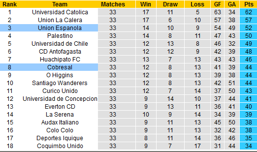 Nếu giành chiến thắng, Union Espanola không cải thiện vị trí trên bảng điểm khi đang ít hơn đội đứng thứ 2 tới 5 điểm. Nhưng dù sao, nếu so sánh về thành tích kể từ đầu mùa, Union Espanola vẫn là trở ngại quá lớn dành cho Cobresal khi hơn tới 5 bậc sau 33 vòng.