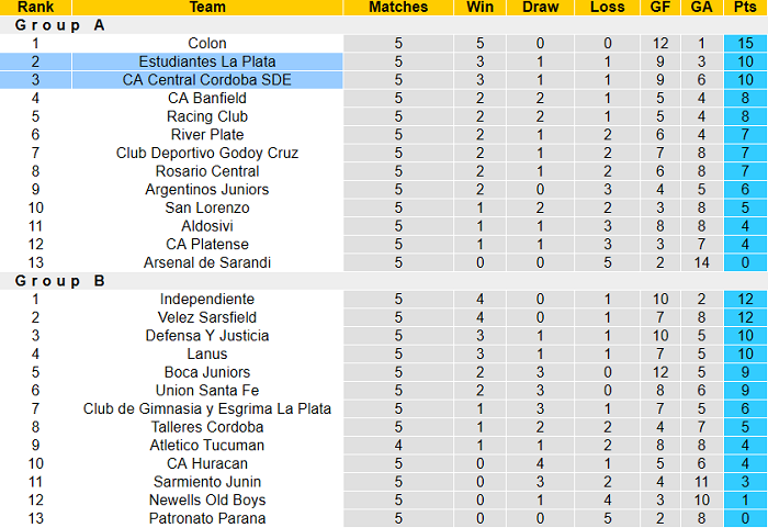 Cordoba và Estudiantes thuộc bảng A. Họ sở hữu thành thích khá tương đồng sau 5 vòng đầu tiên. Mỗi đội có được 10 điểm (thắng 3, hòa 1 và thua 1) nhưng Estudiantes xếp trên Cordoba nhờ sở hữu chỉ số phụ tốt hơn.