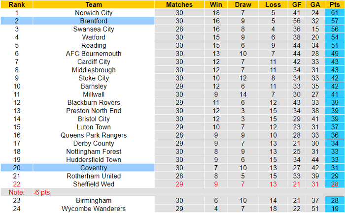 Brentford vì thế cần thắng trở lại để giữ vững vị trí thứ 2 sau vòng 31. Coventry hứa hẹn trở thành đối thủ thích hợp để Brentford chấm dứt cuộc ‘khủng hoảng mini’ này.
