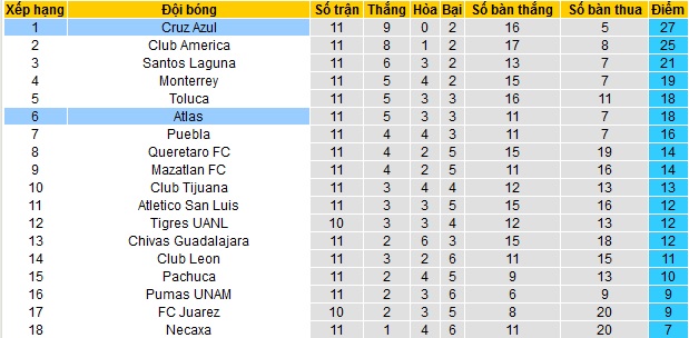 Trong khi đó Club Atlas cũng đã vươn lên vị trí thứ 6 của bảng xếp hạng trong nhóm các đội có suất dự play-off. Với 18 điểm có được cũng sau 11 vòng đấu, Club Atlas đang có bằng điểm với đội thứ 5 Toluca và chỉ còn cách Top 4 có đúng 1 điểm.