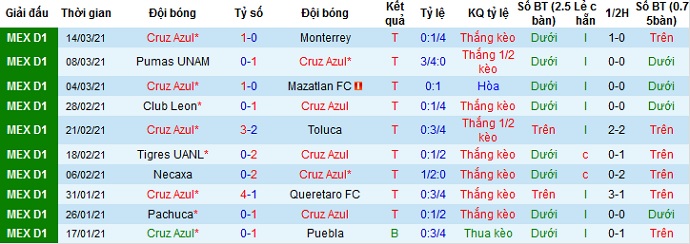 + Thống kê 10 trận gần nhất của Cruz Azul