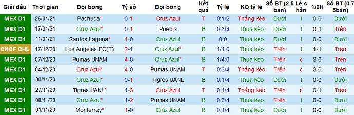 + Thống kê 10 trận gần nhất của Cruz Azul