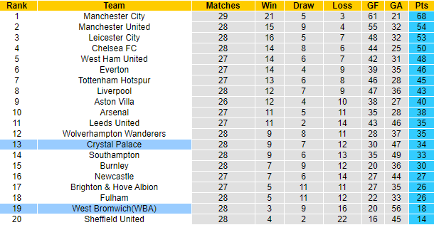Thế nhưng dù thành tích vượt trội, trận đối đầu sắp tới lại được chơi trên sân nhà, Crystal Palace vẫn không được tin tưởng vào khả năng đánh bại West Brom. 3 trận liên tiếp gần đây tại Premier League, Crystal Palace thua 1, hòa 2 và chỉ ghi được 1 bàn thắng. Đội hình vắng 8 cầu thủ vì chấn thương, đoàn quân của HLV Roy Hodgson rất khó có thể vượt qua một West Brom đang hồi sinh với 4 trên 5 trận gần đây bất bại.