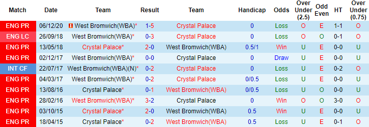 Crystal Palace đánh bại West Brom với tỷ số 5-1 ở trận đối đầu giai đoạn lượt đi Ngoại hạng Anh mùa này ngay trên sân khách. Đó cũng là chiến thắng thứ 3 liên tiếp của Crystal Palace trước West Brom tính trên mọi đấu trường. Lúc này, Crystal Palace đang xếp trên West Brom 6 bậc ở bảng xếp hạng Premier League. Cụ thể, West Brom xếp thứ 19 với 18 điểm, Crystal Palace xếp thứ 13 với 34 điểm.