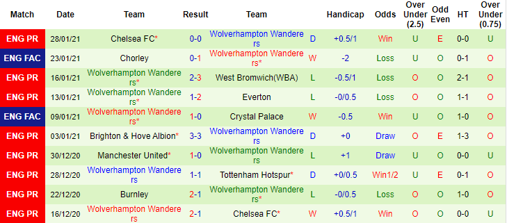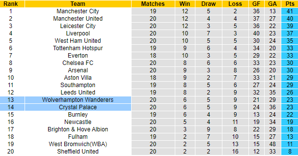 4 trận gần đây Crystal Palace thua 3, hoà 1. Trên sân nhà, đoàn quân của HLV Roy Hodgson không thắng 5 trên 6 trận trước đó thuộc khuôn khổ Premier League. Bên kia chiến tuyến, Wolves với lối chơi thực dụng vẫn đang có được những kết quả thuận lợi trên sân khách. 3 trận xa nhà vừa qua, Bầy sói bất bại với 1 chiến thắng và 2 trận hoà.