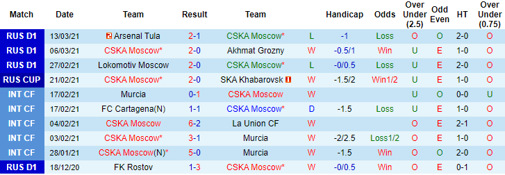 + Thống kê 10 trận gần nhất của CSKA Moscow