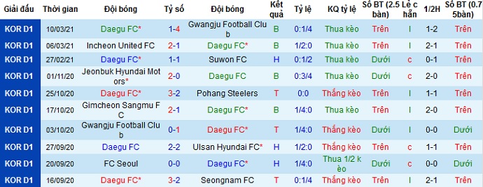 + Soi tỷ lệ kèo châu Á: Với lợi thế sân nhà nên cho dù đang đứng áp chót bảng xếp hạng thì Daegu FC vẫn được đánh giá là đội cửa trên, tuy kèo chấp cũng chỉ ở mức -0,25.