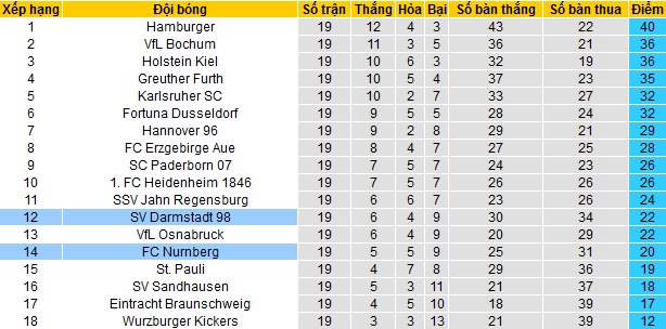 Trong khi đó Nürnberg ở mùa giải trước cũng đã phải rất vất vả để trụ lại tại giải hạng nhì khi lách qua khe cửa hẹp ở trận play-off. Thế nhưng hiện tại Nürnberg cũng đã tiến sát đến nhóm các đội cầm đèn đỏ khi đang đứng ở vị trí thứ 15 với 20 điểm cũng sau 19 vòng đấu.