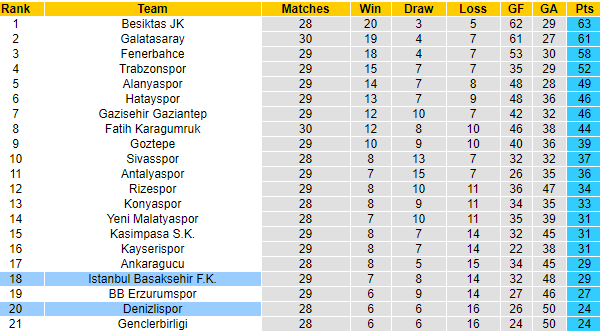Khoảng cách giữa Istanbul Basaksehir và đối thủ xếp trên chỉ là về hiệu số, nhưng nhìn ở khía cạnh phong độ, Istanbul BB có phần lép vế. Nhìn chung thì cuộc chiến này có thể coi là chung kết với cả Denizlispor lẫn Istanbul Basaksehir.