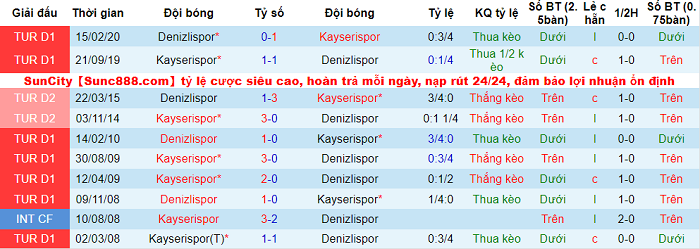 Dù không sở hữu thành tích ấn tượng nhưng Kayserispor thường tỏ ra có duyên mỗi khi chạm trán Denizlispo. Kayserispor bất bại 5/6 lần so tài gần nhất trên mọi đấu trường với Denizlispor và có được 4 chiến thắng. Mặt khác, tỷ lệ thắng kèo trên sân nhà mùa này của Denizlispor chỉ là 42.86%: thắng 3, thua 4.