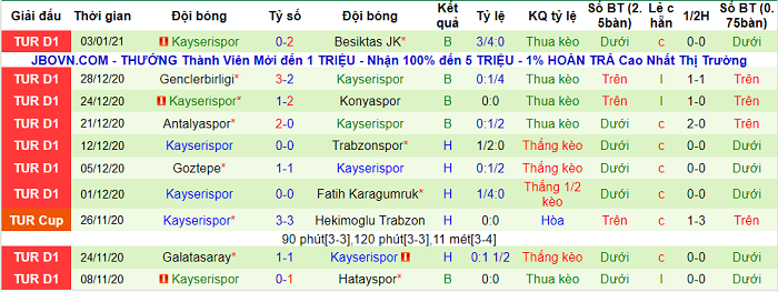 Kayserispor toàn thua cả 4 trận gần nhất thuộc khuôn khổ giải VĐQG Thổ Nhĩ Kỳ. Họ ghi được 3 bàn thắng nhưng nhận cả thảy 9 bàn thua ở chiều ngược lại. 4 thất bại liên tiếp vừa rồi cũng kéo theo việc Kayserispor liên tục thua kèo.