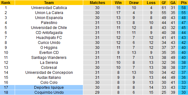 Đây là trận đối đầu giữa 2 đội yếu kém nhất tại giải vô địch Chile ở thời điểm hiện tại. Nếu như Deportes Iquique đứng áp chót với 32 điểm sau 30 trận đã đấu, Coquimbo Unido lại xếp bét bảng với 2 điểm ít hơn nhưng lại còn 1 trận chưa đá.