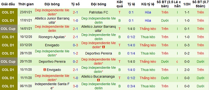 + Thống kê 10 trận gần nhất của Independiente Medellín