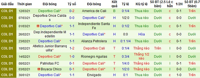 + Thống kê 10 trận gần nhất của Deportivo Cali