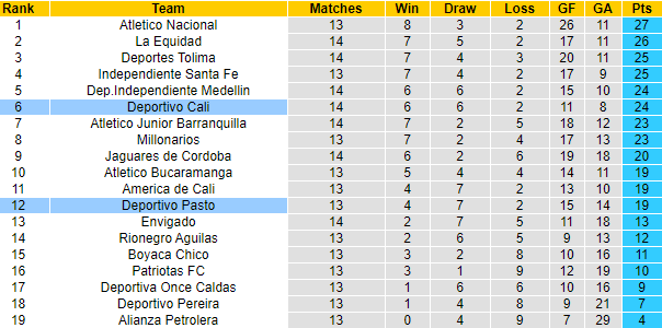 Đấu trường số 1 cấp CLB của Colombia giai đoạn Apertura đang trôi dần về những lượt trận cuối. Deportivo Cali hiện đứng thứ 7 nhưng họ chưa chắc giữ được vị thế của mình. Chỉ hơn vị trí thứ 9 có 4 điểm, cơ hội cán đích trong top 8 sẽ dần nhỏ hơn nếu như Deportivo Cali tiếp tục sa sút.