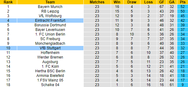 5 trận sân nhà gần đây tại Bundesliga, Eintracht Frankfurt toàn thắng cả về tỷ số và kèo châu Á, xé lưới đối thủ 12 lần. Trên bảng xếp hạng Bundesliga sau 23 vòng đấu, Eintracht Frankfurt vẫn giữ được vị trí trong Top 4 với 42 điểm, hơn đội xếp thứ 5 là Dortmund 3 điểm.