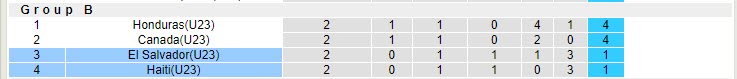 Trong khi đó, Haiti U23 cũng có được 1 trận thua và 1 trận hòa, song đứng cuối cùng trên BXH với hiệu số -3. Cụ thể, họ thua đậm 0-3 trước Honduras U23 và cầm hòa Canada U23 với tỷ số không bàn thắng.