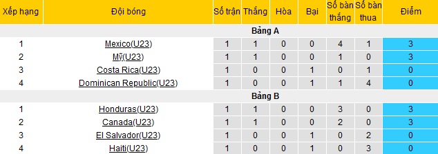 Bảng xếp hạng vòng loại Olympic khu vực Bắc và Trung Mỹ