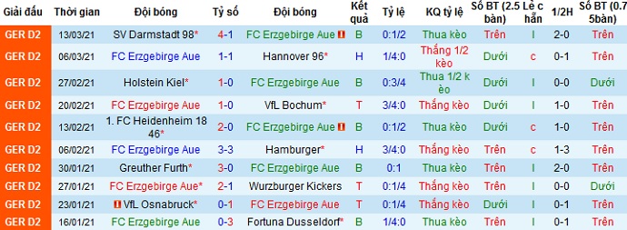 Trong 5 trận đấu gần đây thành tích của Erzgebirge Aue cũng khá tệ khi chỉ có 1 trận thắng, 1 trận hòa và để thua 3 trận. Tuy nhiên trên sân nhà thành tích của đội bóng lại khá tốt và đang bất bại ở 4 trận gần nhất tại đây với 2 trận thắng và 2 trận hòa.