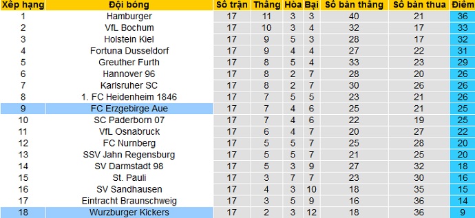 Sau giai đoạn lượt đi tại giải hạng nhì Đức, Erzgebirge Aue chỉ đang đứng thứ 9 trên bảng xếp hạng với 25 điểm sau đúng 17 vòng đấu. Hiện giờ đội bóng đang hơn nhóm các đội cầm đèn đỏ tới 10 điểm, nhưng cũng kém các đội Top 3 có suất thăng hạng tới 7 điểm.
