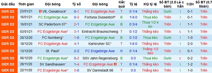 Tuy nhiên phong độ gần đây của Erzgebirge Aue là không tốt khi ở 5 vòng đấu gần nhất đội bóng chỉ thắng được 2 trận, để thua 3 trận. Ngay cả trên sân nhà thành tích của Erzgebirge Aue cũng chỉ tốt hơn đôi chút với 3 trận thắng và 2 trận thua.
