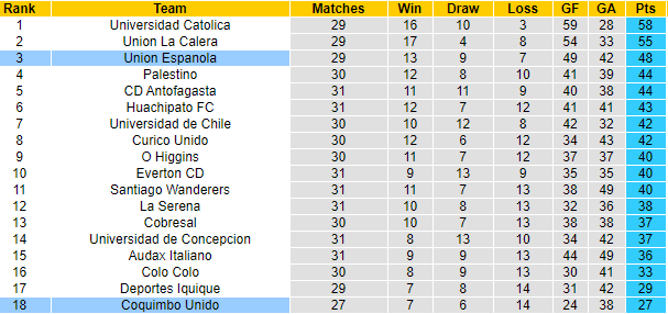 Cần biết rằng 2 đội xếp thứ 3, 4 của giải sẽ được tham dự giai đoạn sơ loại của Copa Libertadores. Đối thủ mà Espanola đụng độ ngày hôm nay – Coquimbo Unido chỉ đang đứng bét bảng và phải đối diện với khả năng xuống hạng. Nhưng cơ hội thoát hiểm với Coquimbo Unido vẫn còn khi họ mới đá có 27 trận.