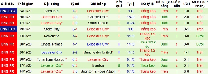 + Thống kê 10 trận gần nhất của Leicester City