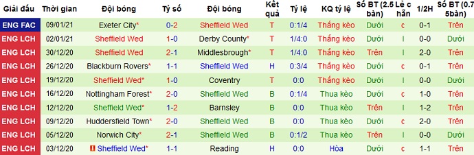 + Thống kê 10 trận gần nhất của Sheffield Wednesday