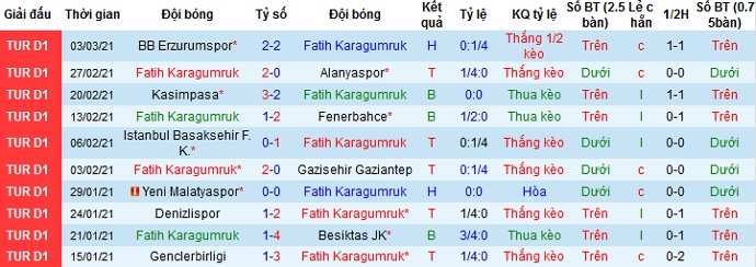 Ở 5 vòng đấu gần đây Fatih Karagümrük có được 2 trận thắng, 1 trận hòa và để thua 2 trận. Ngay trên sân nhà thành tích của Fatih Karagümrük cũng chỉ tốt hơn đôi chút khi thắng 3 và hòa 2 sau 5 trận đấu gần nhất tại đây.